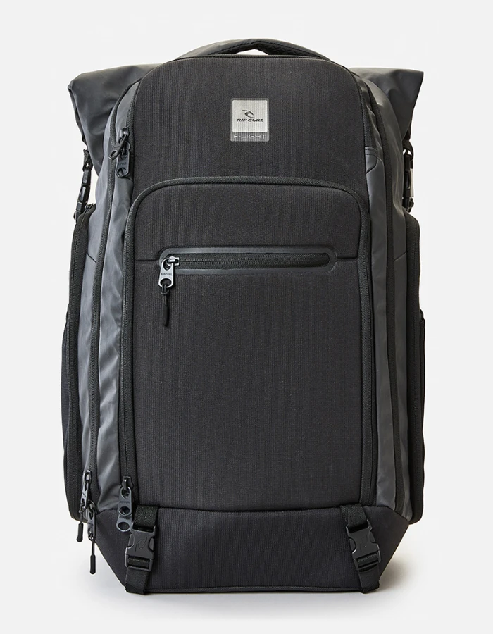 Laptop section, Roll and clip wet/dry section, Dedicated fin organizer, EVA moulded front panel for added protection, External wax & sunscreen organizer, Fleece lined tech pocket, Insulated drink bottle pocket, Breathable backpack straps.