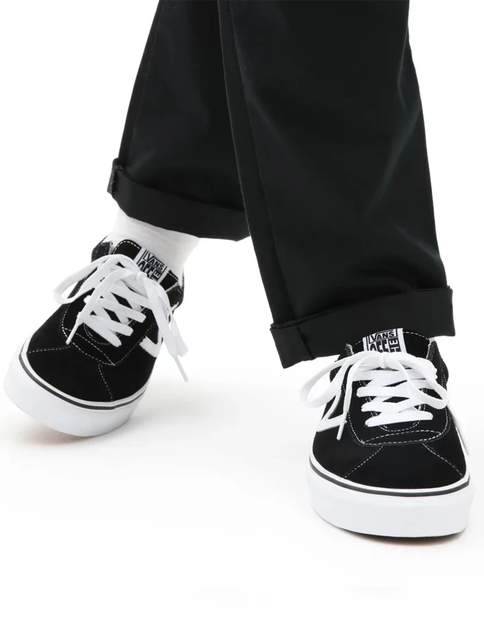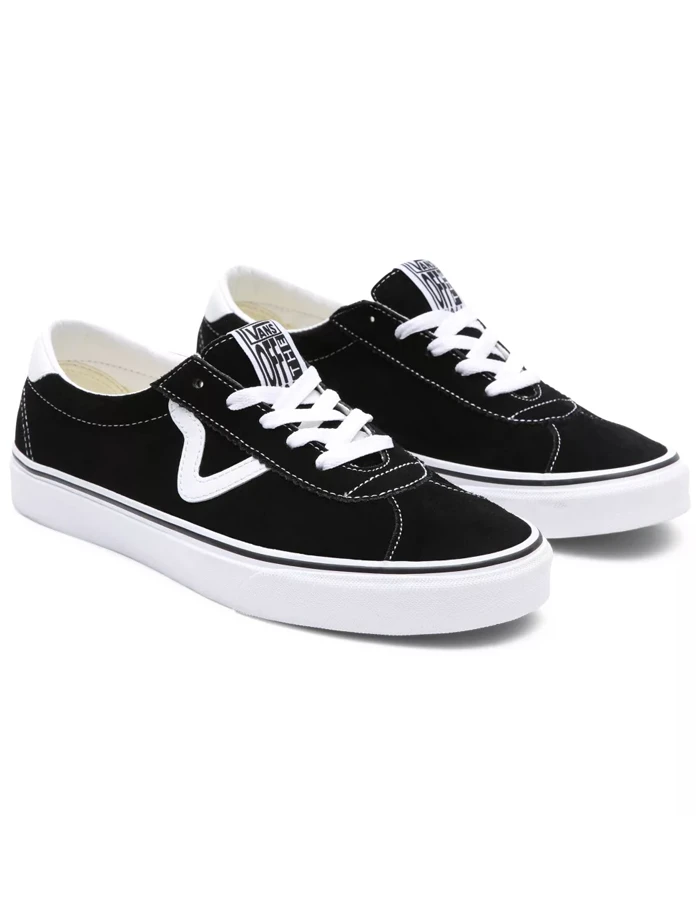 The Suede Vans Sport is a retro lace-up style featuring sturdy suede uppers with leather accents, old school V sidestripes, padded collars, and signature rubber waffle outsoles.